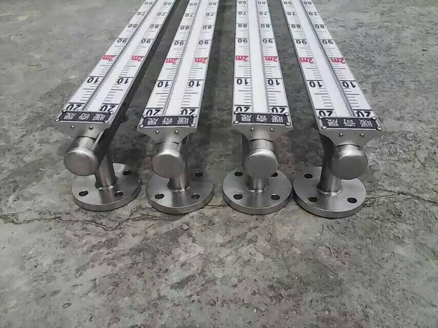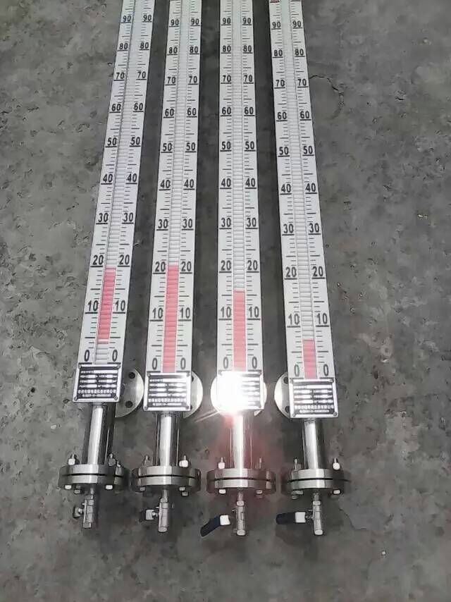 液位計根據浮力原理和磁性耦合作用原理工作的。當被測容器中的液位升降時,液位計主導管中的浮子也隨之升降,浮子內的永久磁鋼通過磁耦合傳遞到現場指示器,驅動紅、白翻柱翻轉180°,當液位上升時,翻柱由白色轉為紅色,當液位下降時,翻柱由紅色轉為白色,指示器的紅、白界位處為容器內介質液位的實際高度,從而實現液位的指示。